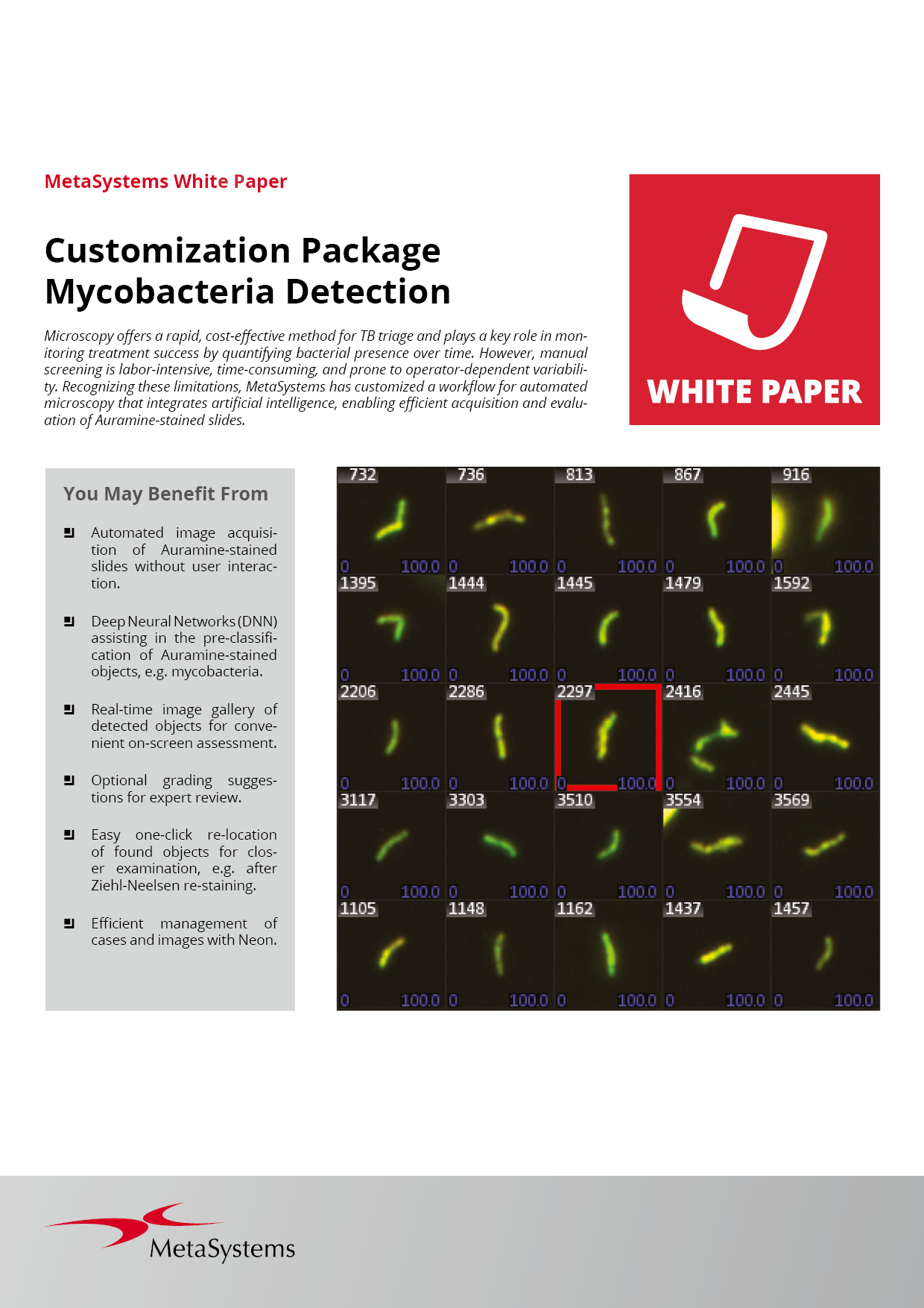 Users can implement a customized Deep Neural Network (DNN) to pre-qualify the found objects. They can also choose to set up a suggested grading of the detected Auramine-stained objects. The trained experts can easily confirm, modify, or reject these computer-generated proposals. For those accustomed to performing additional Ziehl-Neelsen staining, the software stores the XY coordinates of each identified object so that users can effortlessly re-locate them with a single mouse click.