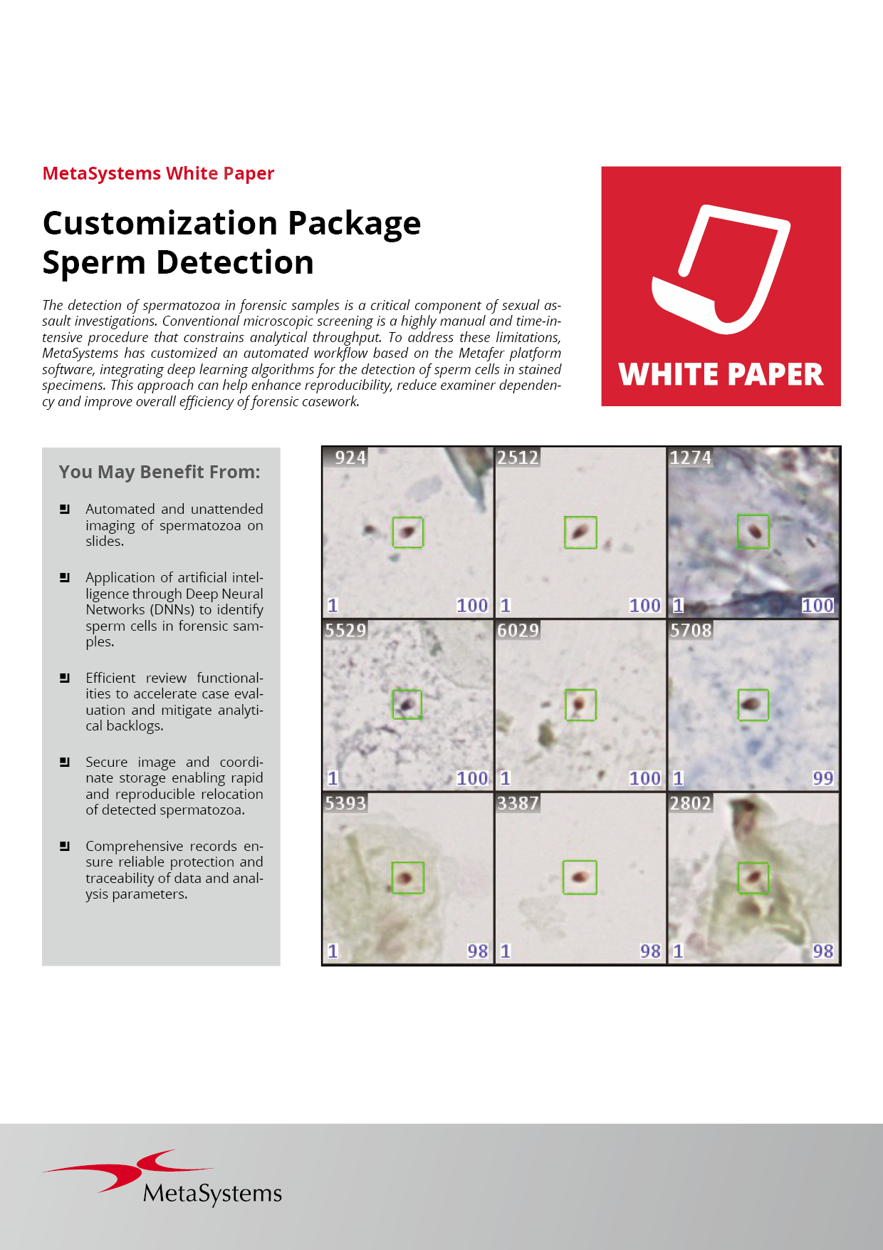 MetaSystems offers Customization Packages for application workflows that have been successfully implemented for customer labs using standard Metafer platform functionality. It is expected that they can be implemented for other customer labs using similar workflows and slide preparation procedures. If a Customization Package is purchased, MetaSystems product specialists will – based on their experience from other similar application cases - support the customer lab in adapting the Metafer software configuration to their needs. The performance of the solution will depend on the quality of the customer slides and the expertise of the users, MetaSystems cannot specify or guarantee any performance parameters. The validation of the solution for clinical use is the sole responsibility of the customer lab.